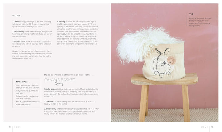 A few of the projects for the Home: Velvet Eucalyptus Cushion, Panda on Cork, Hummingbird, Dish Towels, Naive Art Vase, Faces Coverlet