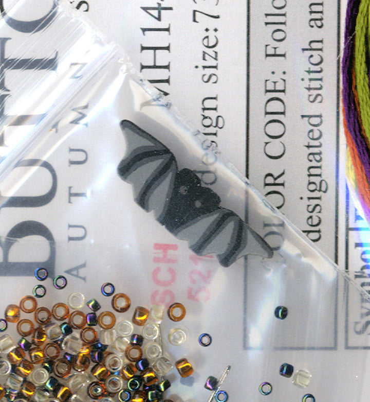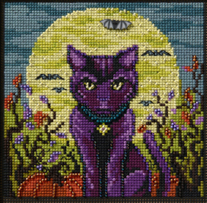 Spooky Cat cross stitch kit that includes glow-in-the-dark beads. It's an eerie close-up view of a black cat in a pumpkin field. In the night sky behind the menacing feline is a huge full moon. The included glass beads add depth and dimension to the scene. Towards the top of the moon is where you affix a bat button (included.) Great for any lover of Halloween and of the Fall season.