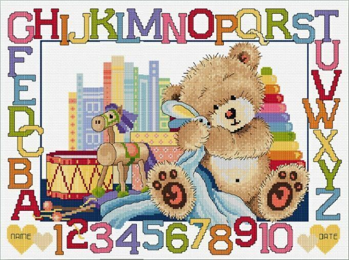 Teddy Birth Sampler counted cross stitch kit. A colourful design - great for any nursery or child’s room. ABC’s, cute teddy and a bunny rug.