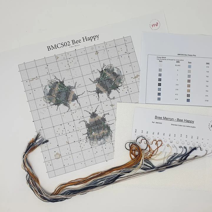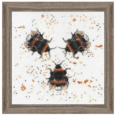 Bee Happy Cross Stitch Kit from the Bree Merryn Fine Art Collection by My Cross Stitch. Three bumble bees in a dance.