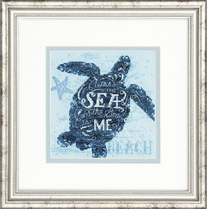 Sea Turtle Cross Stitch Kit by Dimensions. It is an awesome design of a large sea turtle silhouette swimming in the ocean. On the turtle's back you stitch the phrase "I Am The Sea And The Sea Is Me". This project is for anyone that enjoys inspirational sea life sayings, nature or for a turtle lover - especially someone that loves the majestic sea turtle. The design would go well in a beach house or any child's room.