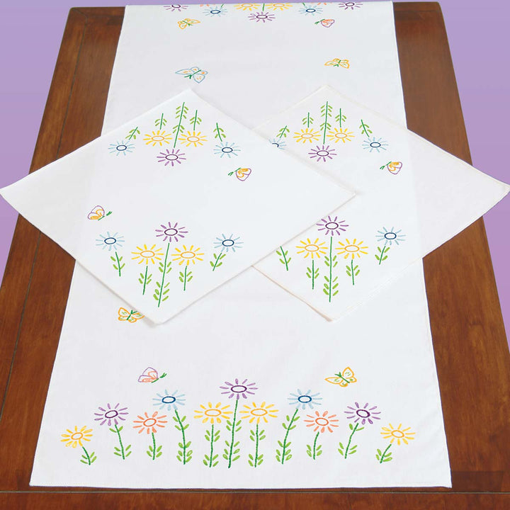Field of Flowers Perle Edge Scarf and Doilies Set Stamped embroidery design features flowers with butterflies.