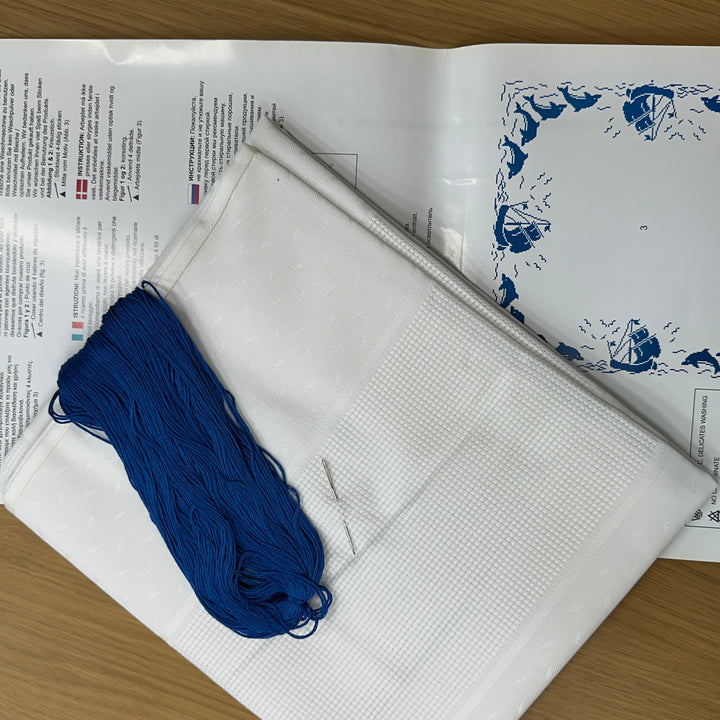Dolphins & Ships counted cross stitch tablecloth kit from Gobelin-L contains antique white cotton tablecloth with 10 count Aida border.