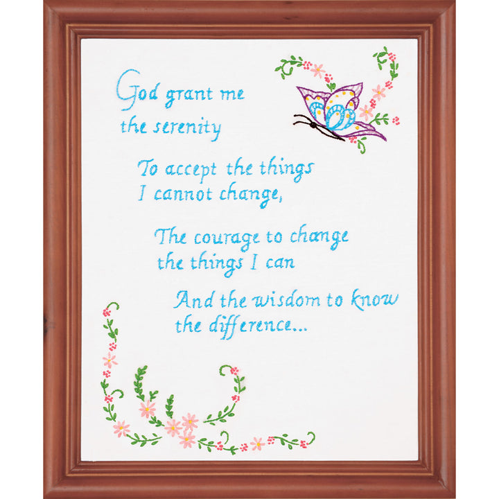 Serenity Prayer Sampler is a stamped embroidery that features the sentiment "God grant me the serenity to accept the things I cannot change, the courage to change the things I can, and the wisdom to know the difference".