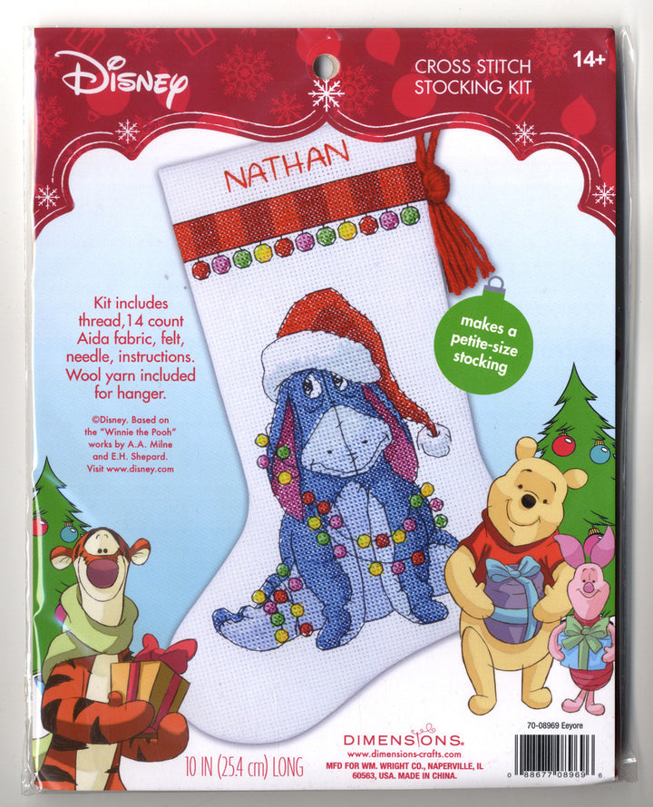 Eeyore from Disney is a cross stitch kit is a cute design of Winnie the Pooh's buddy Eeyore. Eeyore is wearing a Santa Claus hat and is draped in a string of colourful Christmas bulbs. At the top edge of the stocking is a white band where you stitch the lucky recipient's name for a personalised gift and keepsake! Red yarn is included to fashion a hanger. Perfect for anyone who loves the Disney story "Winnie the Pooh" (especially Eeyore!)