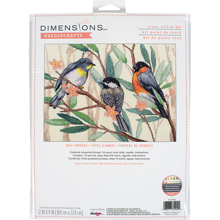 Tree Toppers its a cross stitch kit by Dimensions with a design of three birds in nature perched on floral tree branches. There is an Oriole, a sparrow and a grey bird with white stripes. This woodsy design is perfect for anyone that likes nature scenes or for any bird lover.