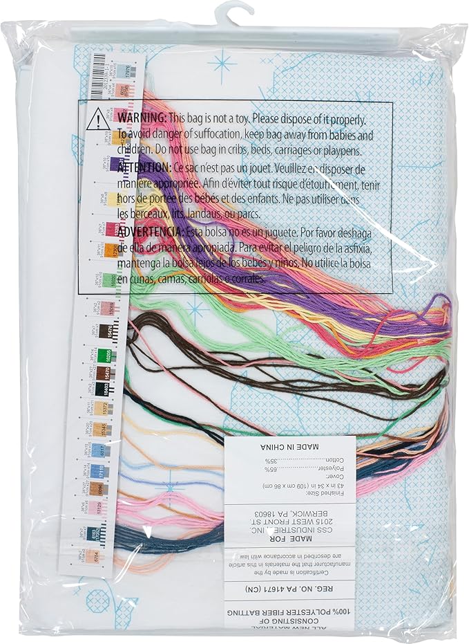 Sweet Prayer Quilt is a stamped cross stitch kit by Dimensions featuring a very cute design of a little blonde angel complete with halo and wings knelt in prayer along side a furry teddy bear. At the corners are flower bouquets of pink, purple and blue flowers with ribbon and in the background are delicate little stars. At the top you add the phrase to recall the timeless children's nighttime prayer: "Now I Lay Me Down To Sleep." Such a lovely design and perfect to keep any lucky little girl or boy snuggly and warm at night.