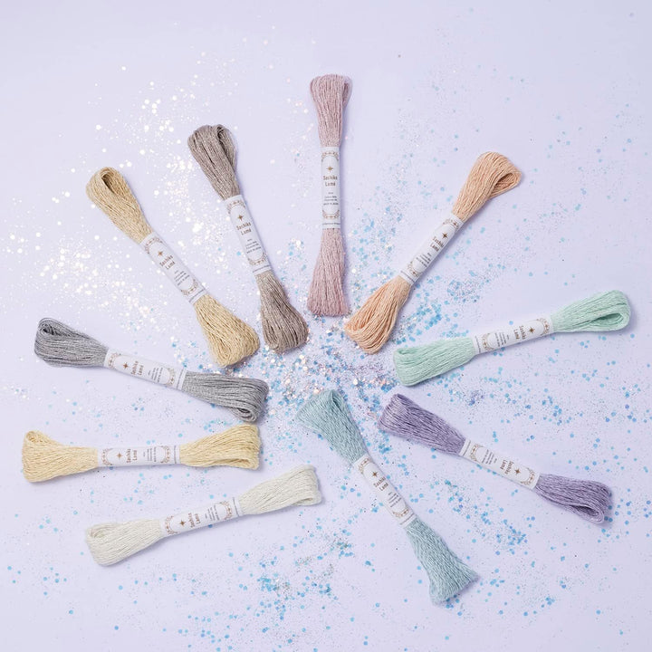 Threads are smooth with a matte finish and come in this pretty array of pastels, enhanced with a thread of shiny silver or gold.