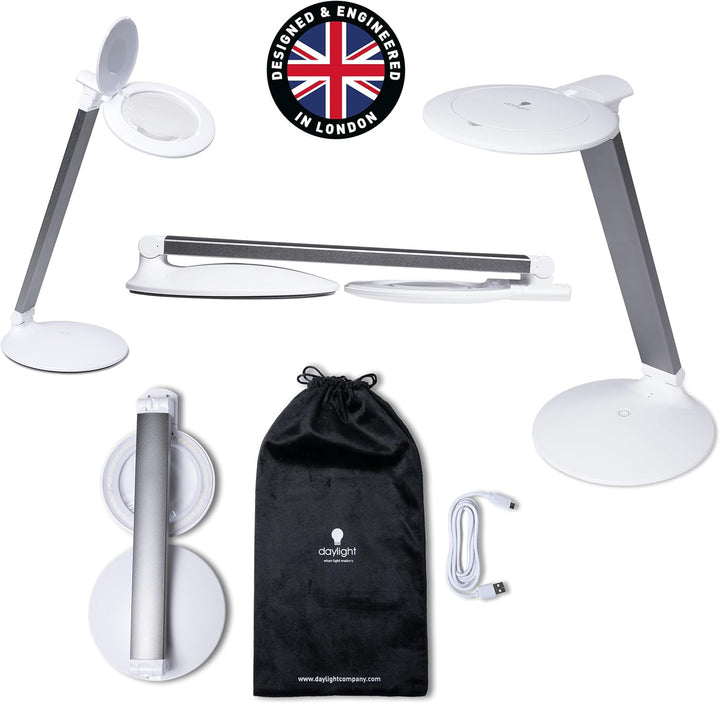 Halo Go 2Rechargeable Magnifier Lamp by Daylight is truly portable lamp with Magnifier that comes with a USB rechargeable battery. The brightness remains consistent for a full 8 hours on the lower brightness setting and for 4 hours on the full brightness setting. Modern and compact, all-purpose, lightweight table magnifier providing 5 diopter (2.25X) magnification with a 12 diopter (4.0X) inset lens. Taking up a small place on your desk but powerful enough for working on projects that need close to details. Slim, compact design. The daylight LEDs provide high contrast and accurate colour matching. It is also foldable so it is ideal for travelling. It fits perfectly in a sewing bag or briefcase and comes with a velvet drawstring carry bag.