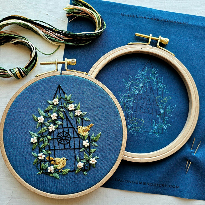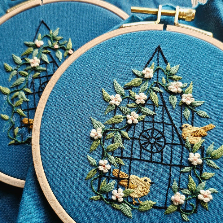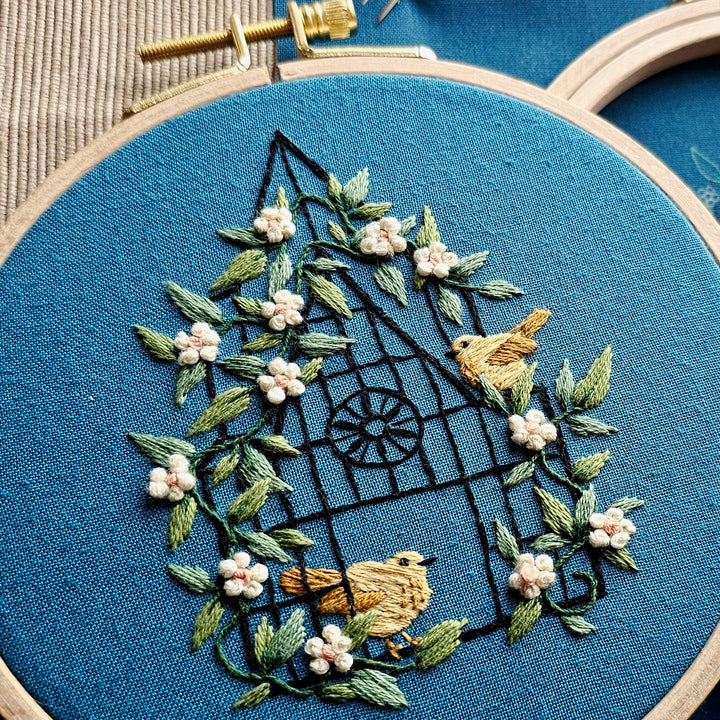 Fly Free embroidery kit by Jessica Long features an open bird cage covered in flowers with two birds. "If you love something, set it free. If it comes back, it's yours. If not, it was never meant to be"