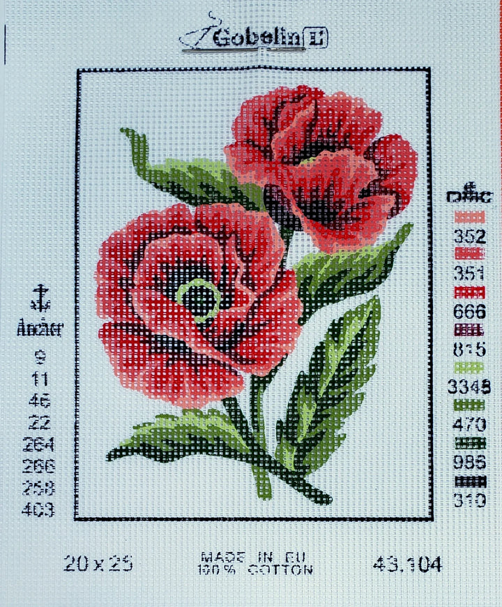 Floral Tapestry Kit by Gobelin L is a printed canvas kit with stranded cotton threads. Tapestry stitch (half cross stitch) is used to complete this beautiful design.