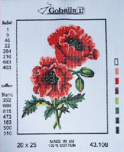 Floral Tapestry Kit by Gobelin L is a printed canvas kit with stranded cotton threads. Tapestry stitch (half cross stitch) is used to complete this beautiful design.