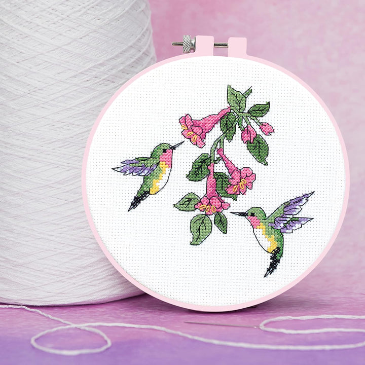 Hummingbird Duo cross stitch kit features Hummingbirds hovering among a blaze of fuchsia blossoms in this easy beginner design.