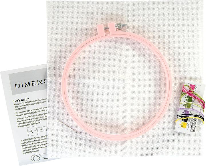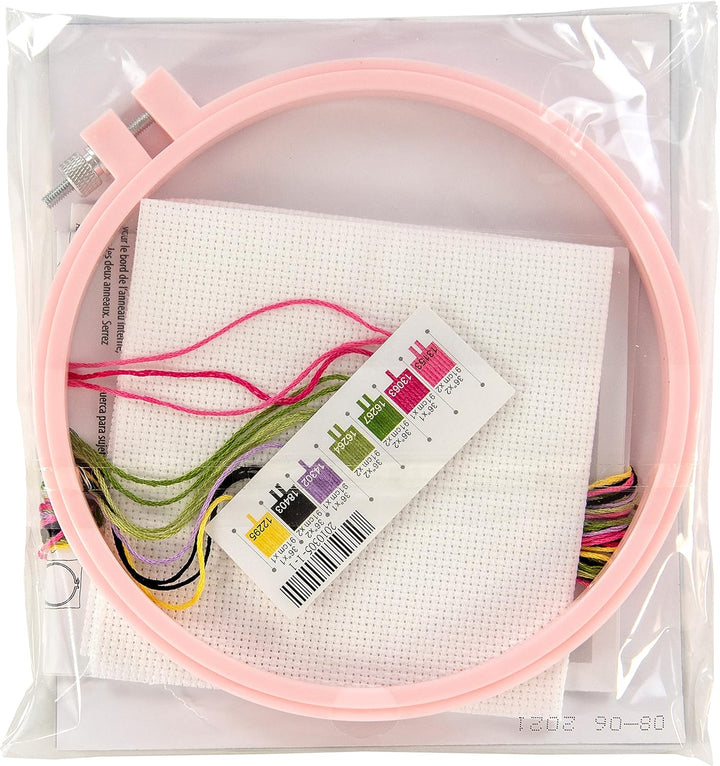 The enclosed pink plastic stitching hoop doubles as a frame for displaying your completed project.