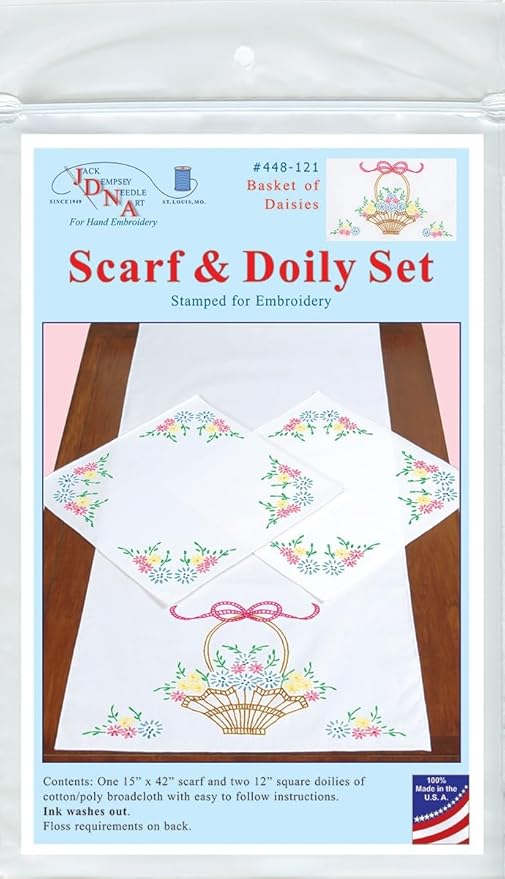 Basket of Daisies Scarf & Doilies Set Stamped Embroidery by JDNA 448-121