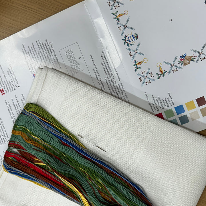 Christmas counted cross stitch tablecloth kit from Gobelin-L contains antique white cotton tablecloth with 10 count Aida border.