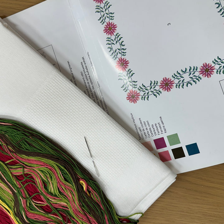 Floral counted cross stitch tablecloth kit from Gobelin-L contains antique white cotton tablecloth with 10 count Aida border.