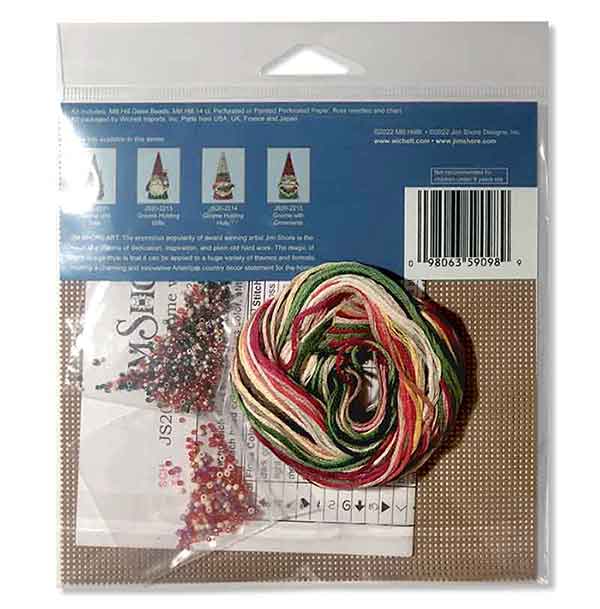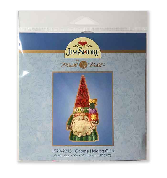 This is one from a set of five 2022 Mill Hill Jim Shore Christmas Series designs (each sold separately.) The four others: Gnome with Tree (JS202211), Gnome with Wreath (JS202212), Gnome Holding Gifts (JS202213), Gnome with Ornaments (JS202215)