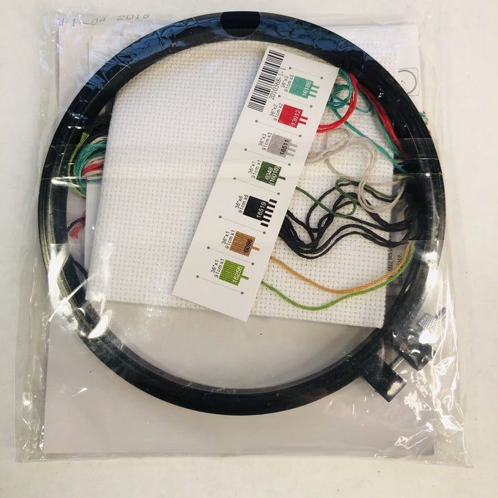 The enclosed matching black stitching hoop doubles as a frame for displaying your completed project.