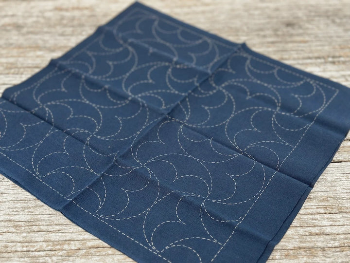 This is known as the Linked Semi Circle sashiko pattern. This design is printed on a navy cotton fabric using water solvable ink.