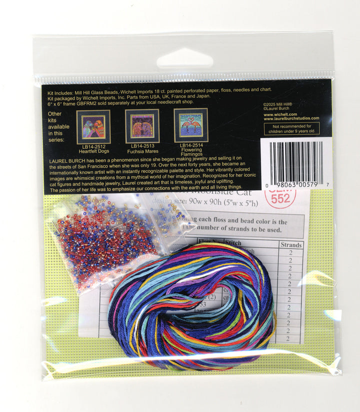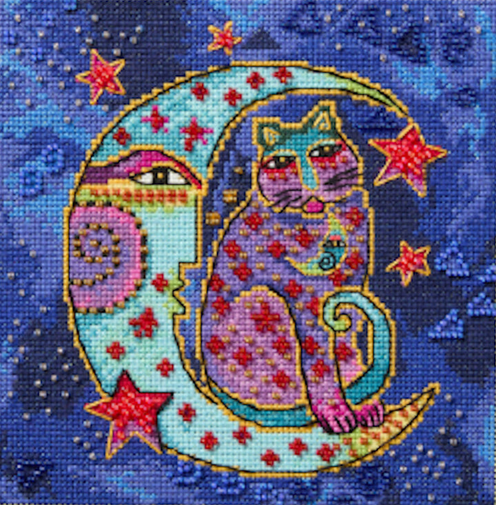 Moonside Cat beaded cross stitch kit is part of the 2025 Laurel Burch Collection. It's an artistic portrait of a kitty sitting on a crescent moon. The cat is shades of purple, red, blue and pink. The moon is blue with dark red stars on and around it. The cat, moon and background are decorated with Mill Hill glass beads that add elegance and dimension to the picture. Great for any fan of Laurel Burch's unique style and especially for anyone who loves her iconic artwork.