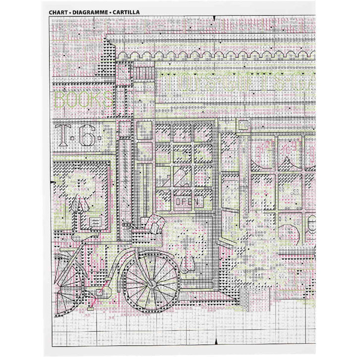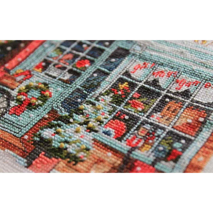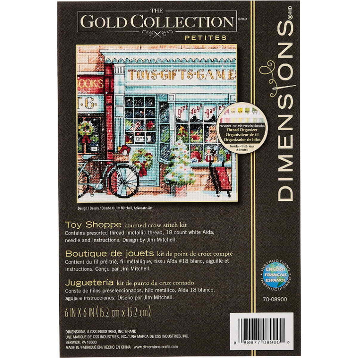 Toy Shoppe Petites Cross Stitch Kit by Dimensions. This is a very cute design of an old fashioned toy store. The store front is muted aqua with a big window made up of little panes, the door also has a top window made of 12 panes of glass and the sign for the store reads, "Toys-Gifts-Games." To the left there is a bicycle parked in front of the store. It has a brown basket that holds a Santa Claus hat. On the right is a decorated Christmas tree and a red and black sleigh is leaning against the front. The front door has a wreath at the bottom and there are Christmas toys that can be seen through the front window. This design brings back memories of Christmas from the old days. It would be the perfect gift for anybody who loves vintage Christmas designs.