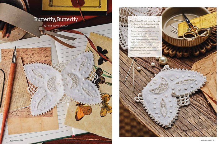 We feature the second in a series of three goldwork knot gardens by Tania Cohen along with beautiful projects utilising a variety of embroidery techniques including crewel, whitework, beading, metal thread and surface embroidery.