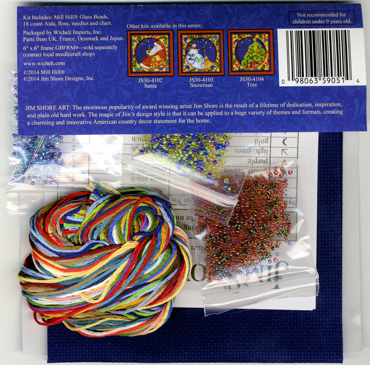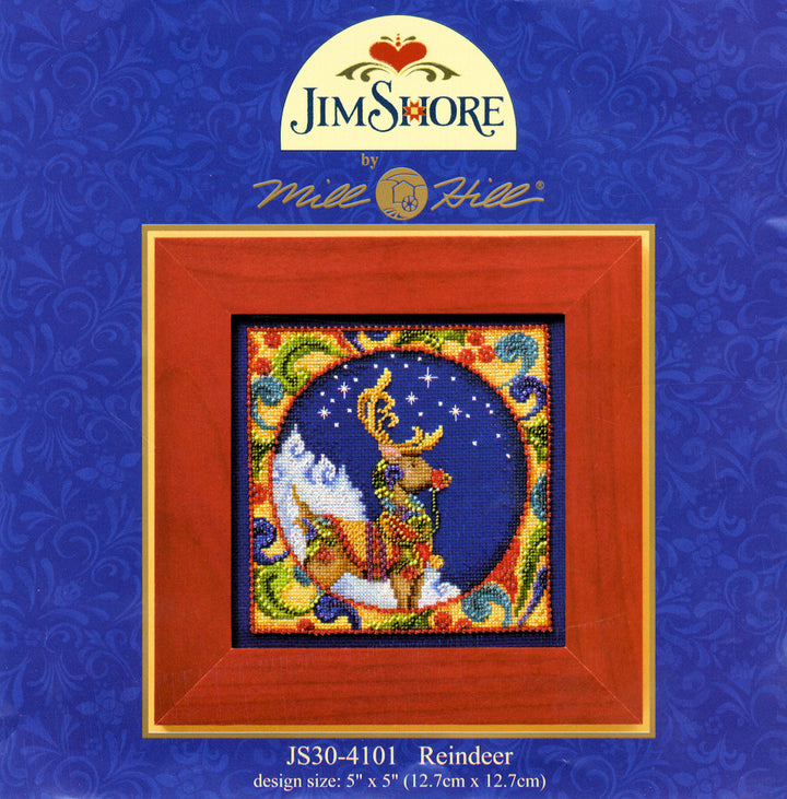 Reindeer cross stitch kit is part of the Winter Series set by award winning artist Jim Shore and Mill Hill . A vision of Yuletide spirit, this magnificent reindeer is adorned in holiday garland resembling a brightly wrapped toy on Christmas morning. The included Mill Hill glass beads add elegance and dimension to the picture. The design is bordered with colourful rosemaling patterns, inspired by the artistic traditions of the Pennsylvania Dutch. Great for any fan of Jim Shore's unique style and especially for anyone who loves his whimsical Christmas portraits
