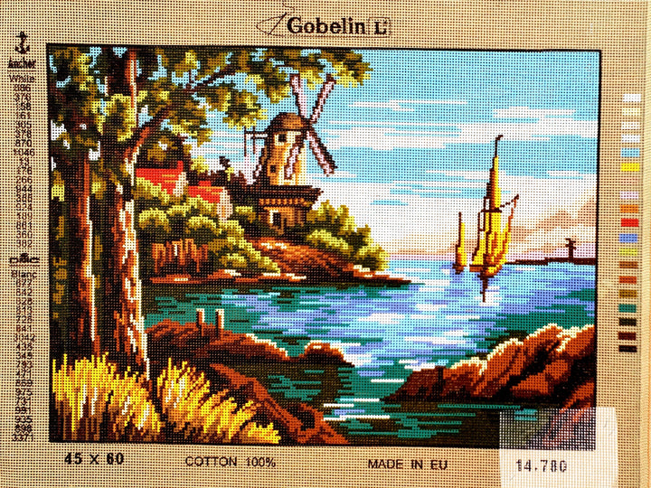 Landscape tapestry canvas featuring a windmill and sailing ships by Gobelin.
