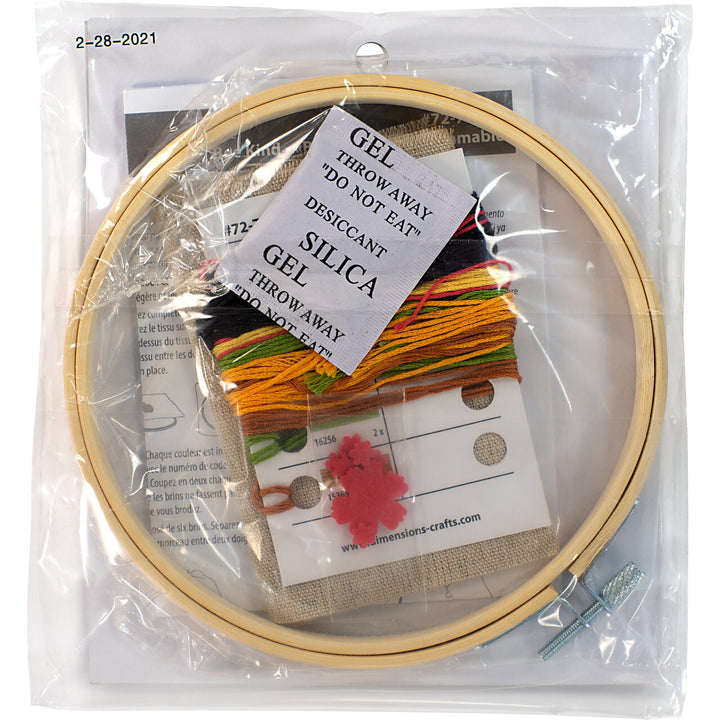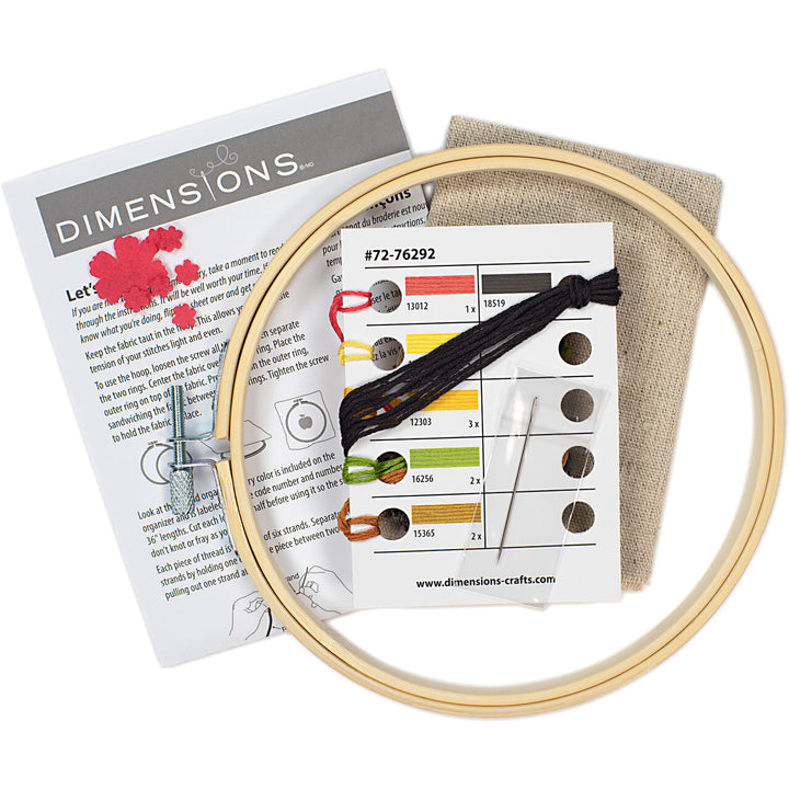 The enclosed bamboo stitching hoop doubles as a frame for displaying your completed project.