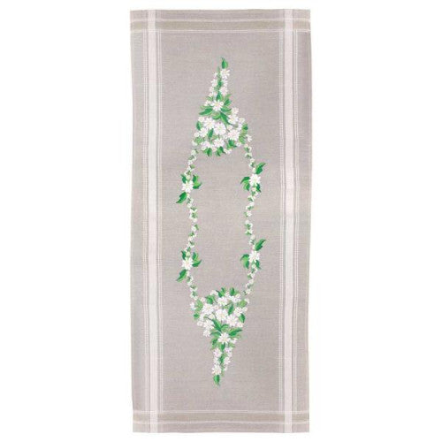 - 62% Linen / 38% cotton hemmed table runner with pre-stamped design outlines