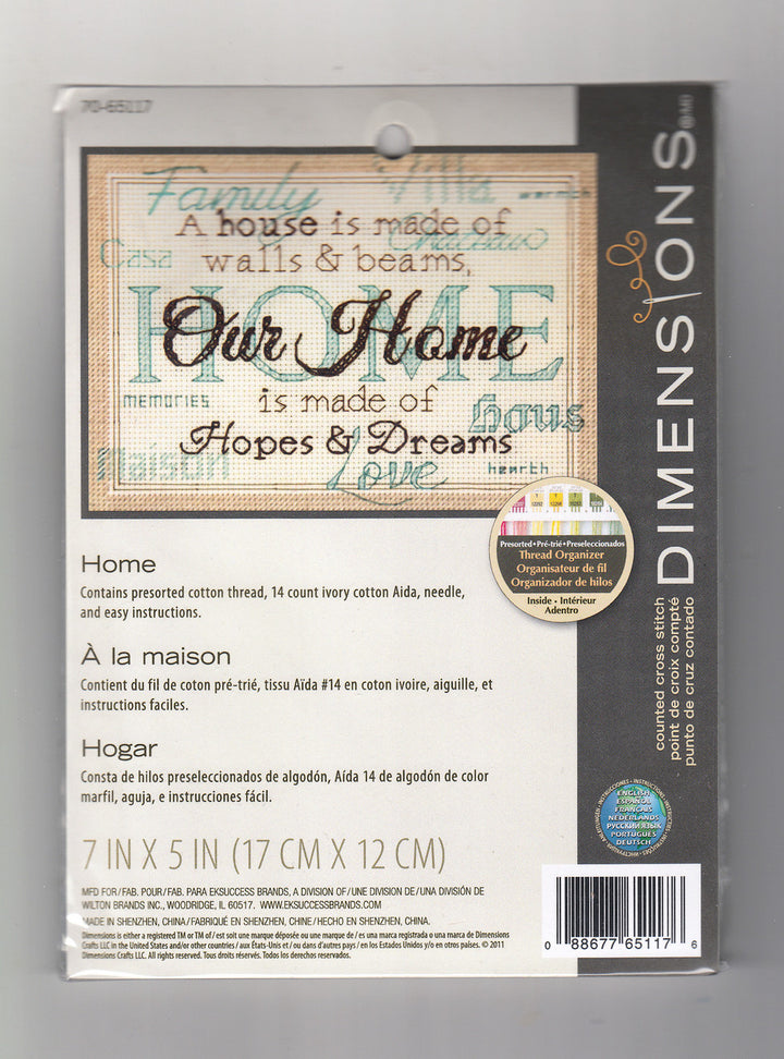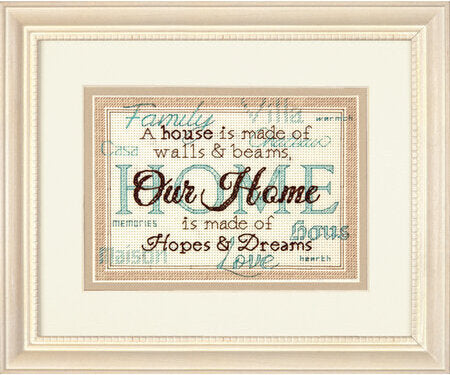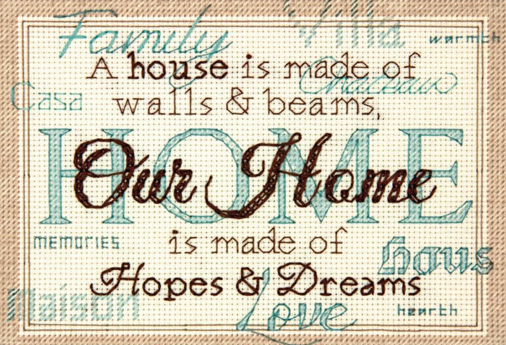 Home Cross Stitch Kit by Dimensions. Celebrate the joy of your home and family with this delightful design. In the foreground you stitch the charming saying "A house is made of walls & beams…Our home is made of Hopes & Dreams" in flowing brown scripts and in the background you stitch "Family" , "Villa", "Home" and more in fluid teal scripts. This wonderful design will add a mosaic of colour to any room in your home or would make a thoughtful, handmade housewarming gift.