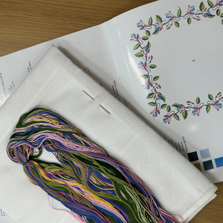 Fuchcias counted cross stitch tablecloth kit from Gobelin-L contains antique white cotton tablecloth with 10 count Aida border.