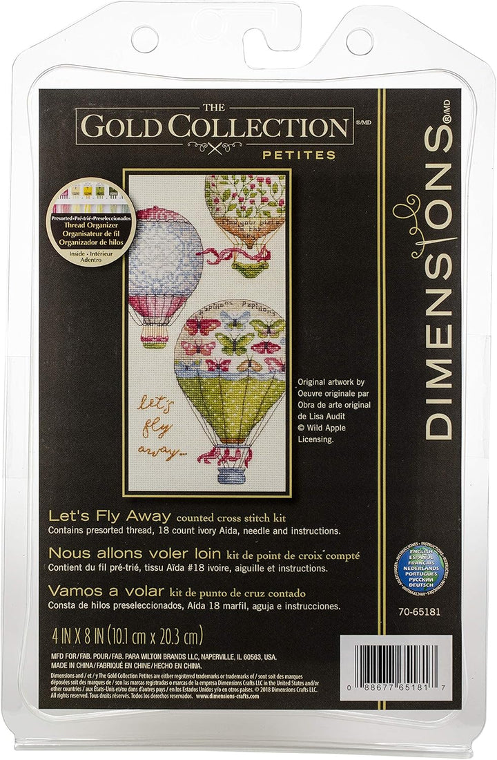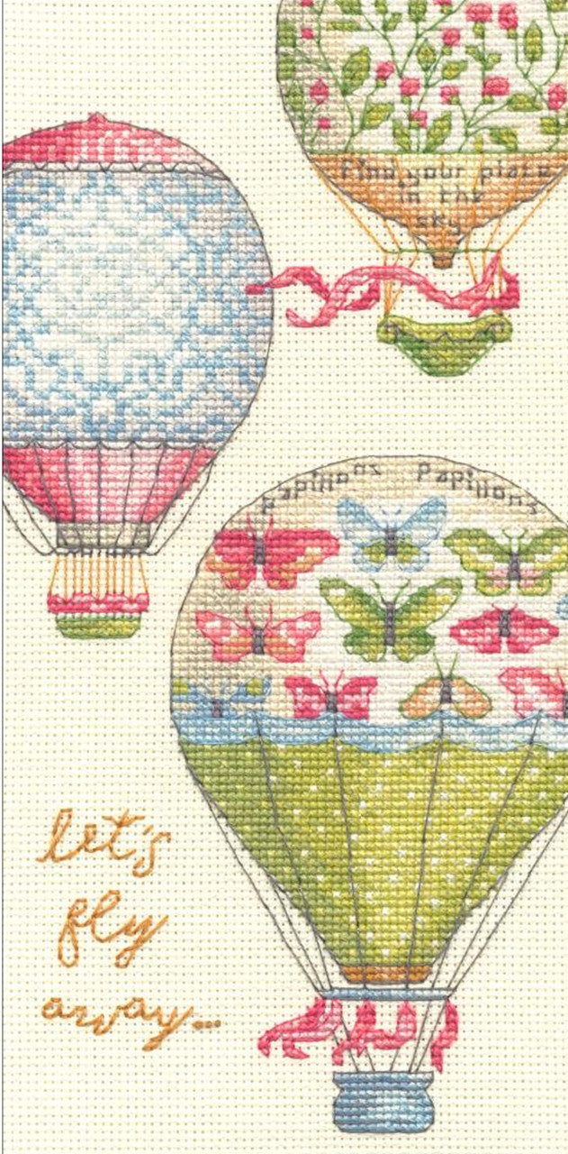 Let's Fly Away Petites Cross Stitch Kit by Dimensions. Enjoy the wonder and awe of hot-air ballooning in a colourfully dramatic way with this wonderful design. Three vibrant balloons gently dance on the air and next to them you stitch the perfect sentiment, "Let's Fly Away" in a flowing golden script. Perfect for any room in your home or to give as a wonderful house warming gift to anyone who wants to fly away.