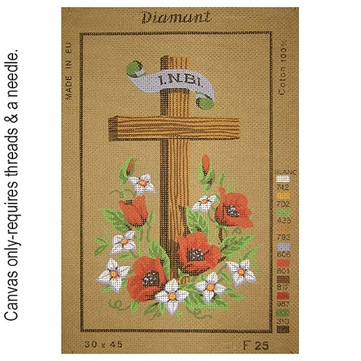 The Cross tapestry canvas by Diamant. This one depicts the Cross with INBI. The INBI or INRI acronyms refer to the inscription added to the cross by Pilate, Iesus Nazarenus, Rex Iudaeorum or Jesus the Nazarene, King of the Jews from John 19:20. The Greek version reads INBI.