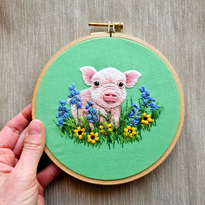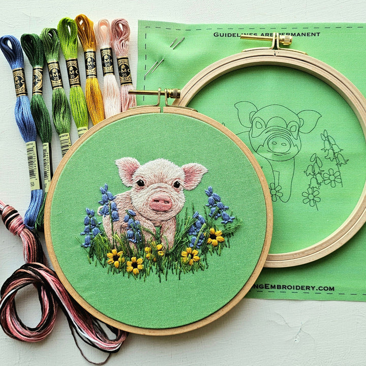 Posing Piglet Embroidery Kit by Jessica Long has everything you need to stitch up your own adorable piglet in a field of daisies and bluebells.