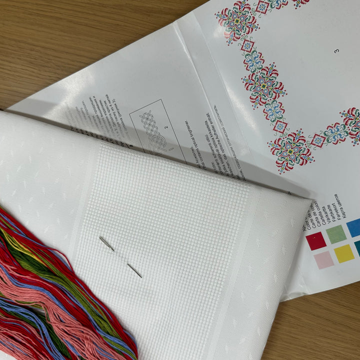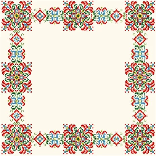 Multicoloured Folk design counted cross stitch tablecloth kit from Gobelin-L contains antique white cotton tablecloth with 10 count Aida border.