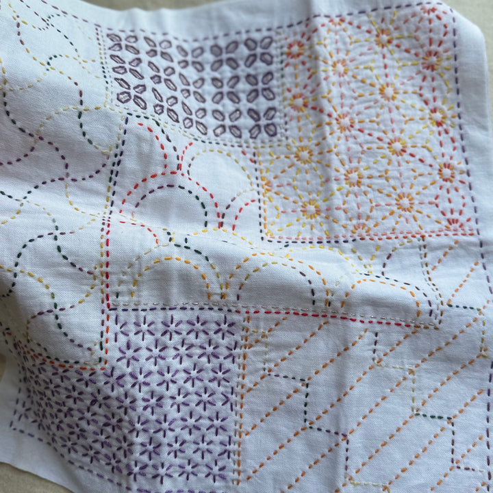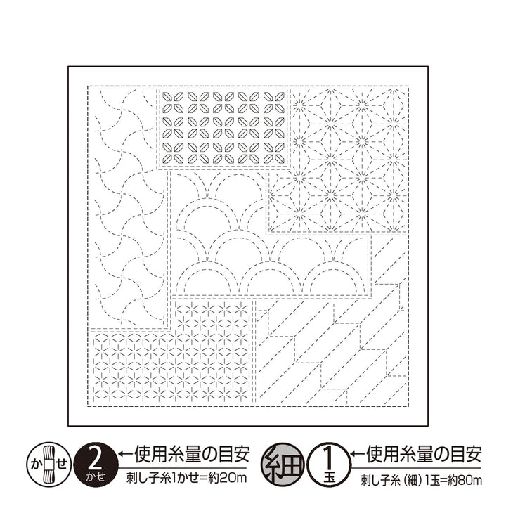 You'll need approximately 40m (2 skeins of 20m/skein Sashiko threads) to complete this hana-fukin sashiko sampler.
