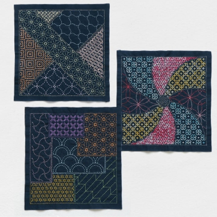 These distinctive sashiko samplers have been stencilled using both traditional and contemporary designs. Following the lines of the printed design, stitches of sashiko thread define the image.