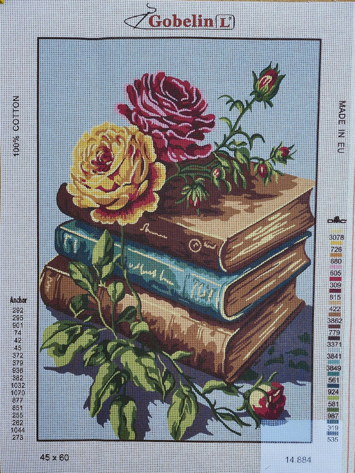 Books printed tapestry canvas by Gobelin features a pile of books topped with flowers.