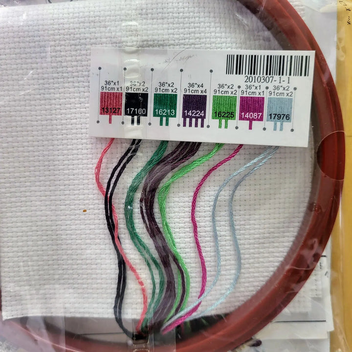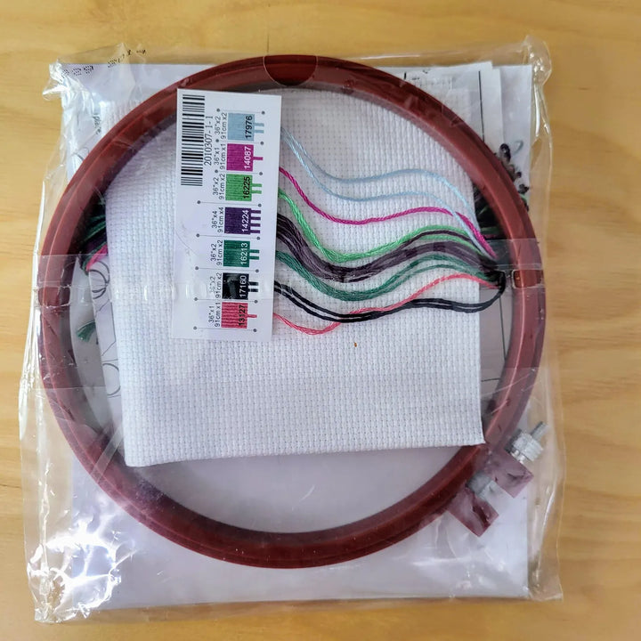 The enclosed rust coloured stitching hoop doubles as a frame for displaying your completed project.