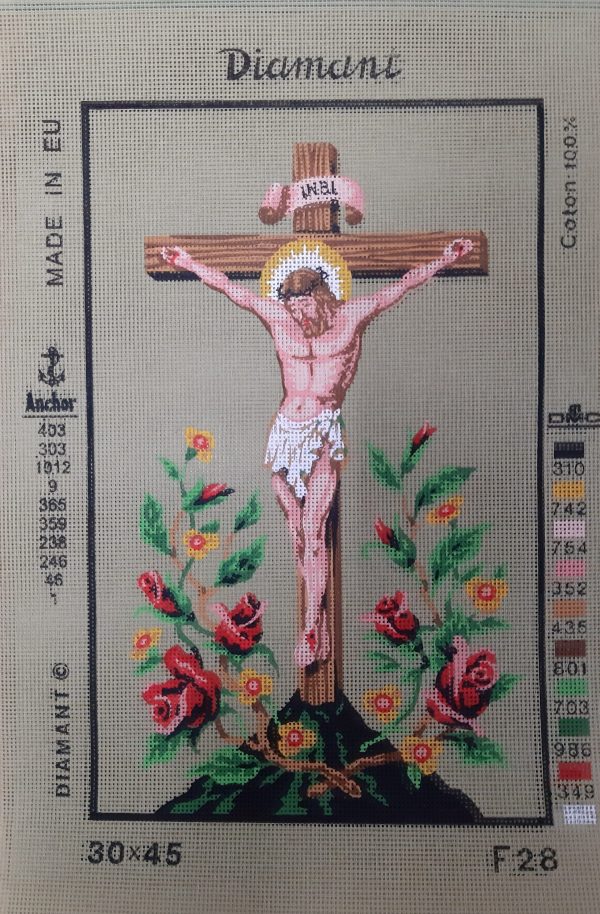 Jesus on the Cross tapestry canvas by Diamant. This canvas depicts the Crucifixion of Christ with roses at the base of the cross.