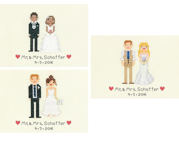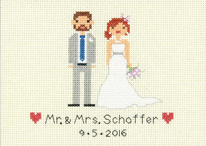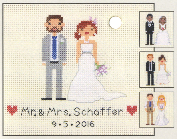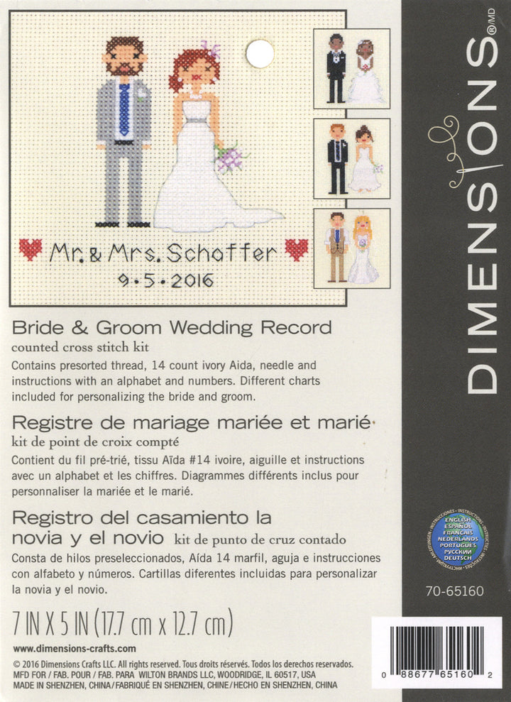 Bride & Groom Wedding Record Cross Stitch Kit by Dimensions. It is a very lovely design of a happy couple on their wedding day. Stitch the bride & groom anyway you want. There's many variations that can be customised including: hair, skin, dress, suit / tuxedo, bouquet, etc.. As a finishing touch one personalises the design with the lucky couples names. This design would make a great wedding or anniversary gift. This keepsake is a perfect way to celebrate that special day year after year.