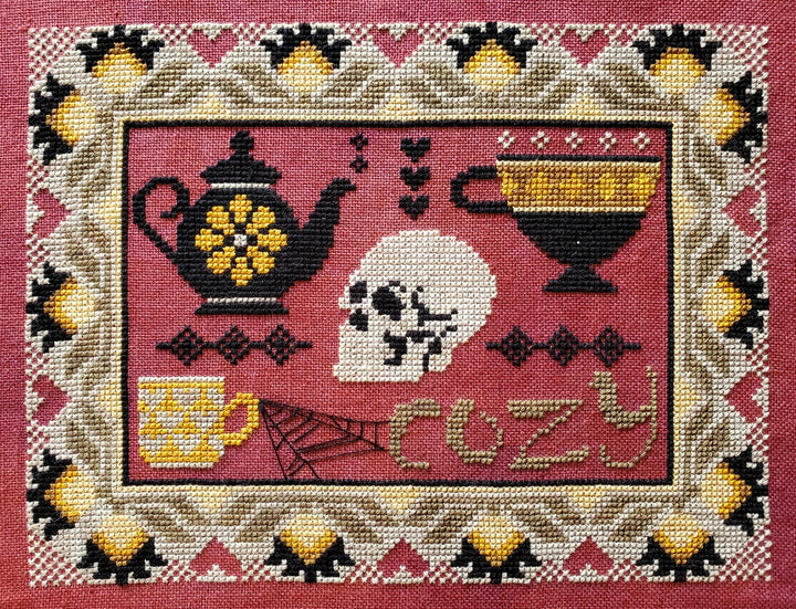 Cozy is a cross stitch pattern from The Artsy Housewife featuring a skull, tea cups, tea pot, spiderweb and the word "cozy".