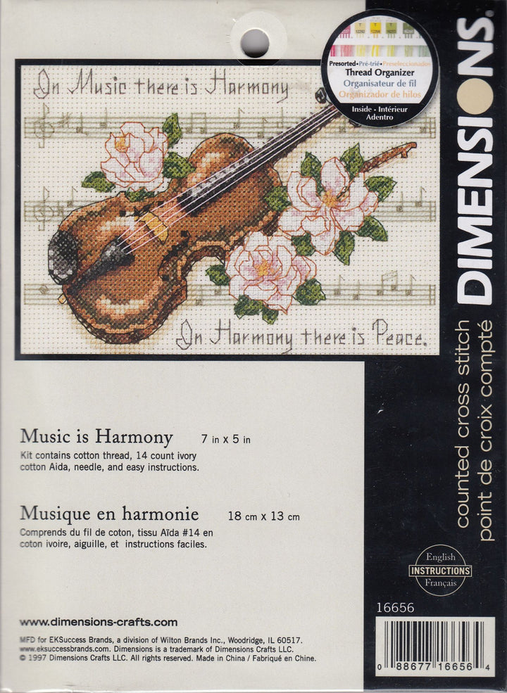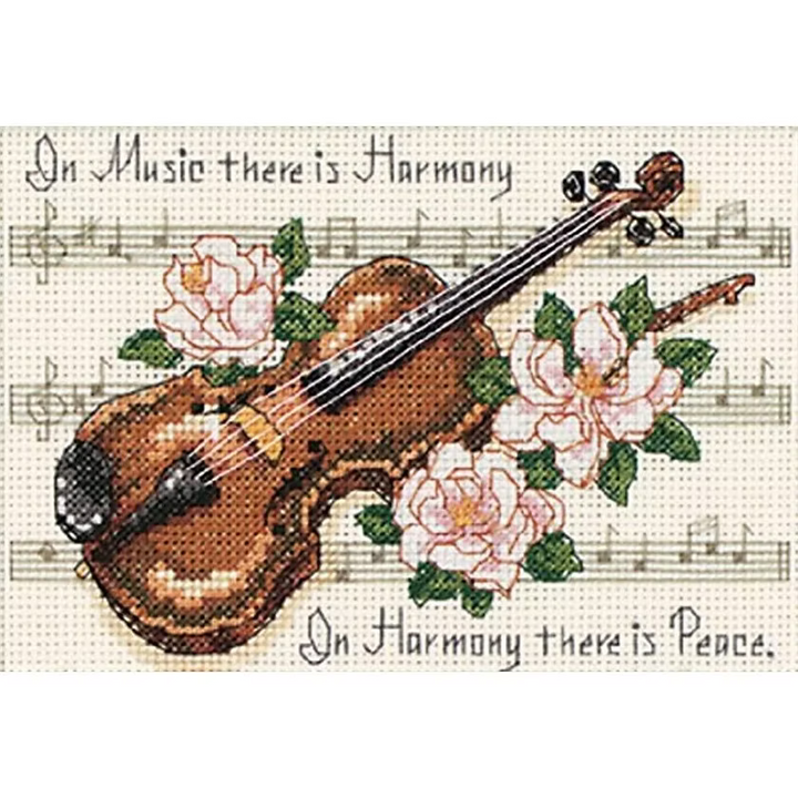 Music in Harmony Cross Stitch Kit by Dimensions features a violin surrounded by flowers with the musical score creating a graceful background. The phrase "In Music there is Harmony. In Harmony there is Peace" is also stitch.