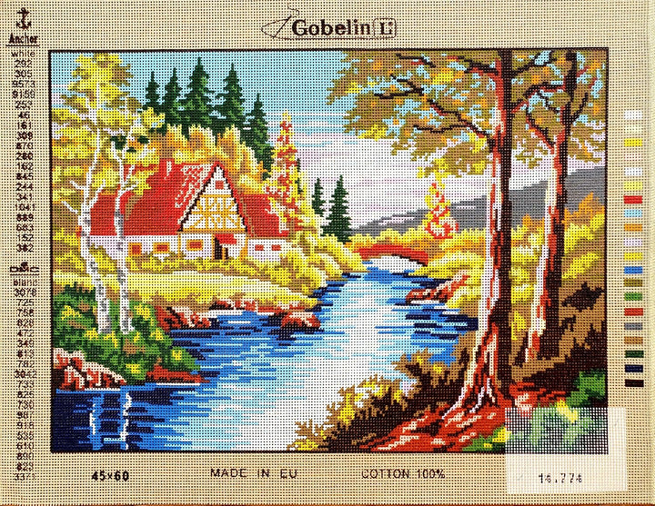Landscape tapestry canvas featuring a cottage by a stream by Gobelin.
