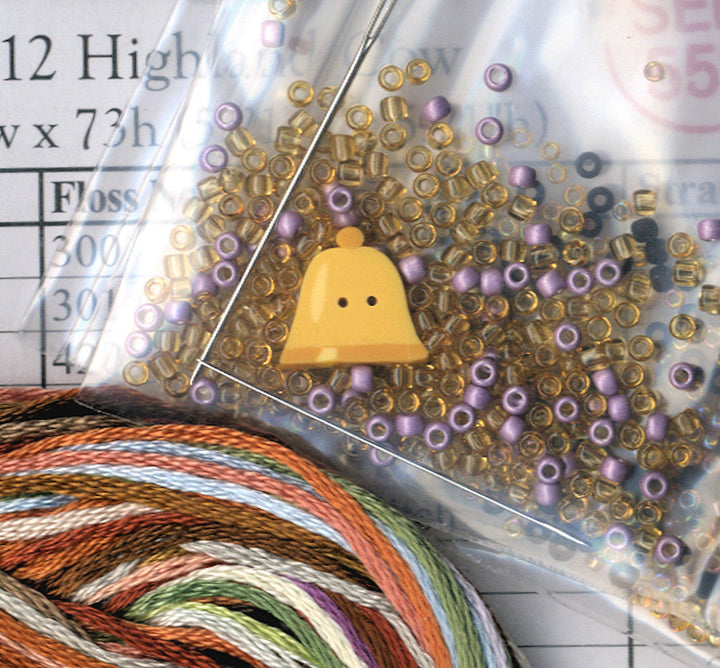 Highland Cow cross stitch kit is part of the 2025 "Buttons and Beads" Spring Series by Mill Hill. It's a lovely close-up design a Scottish breed Highland cow. You add elegance to this beautiful design using the included Mill Hill glass beads. On the cow's collar is where you affix a bell button (included). Great for any lover of these unique cows and the springtime season.